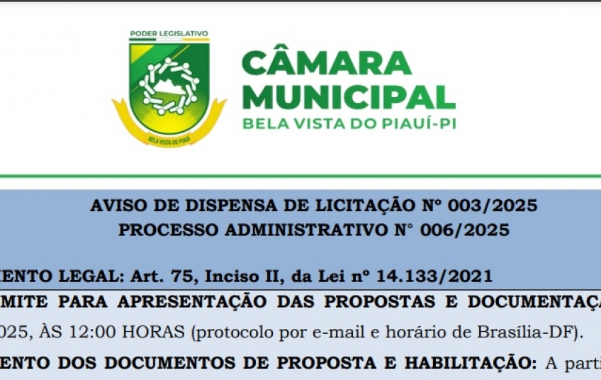 A Câmara Municipal de Bela Vista do Piauí -PI, através da Comissão Permanente de Licitação, torna público a realização de procedimento na modalidade DISPENSA Nº 08/2024 do tipo MENOR PREÇO GLOBAL, por preço unitário, em conformidade com a Lei Federal nº 14.133/2021, Lei Complementar nº 123/2006, cujo objeto é a contratação de empresa especializada na prestação de serviços de licenciamento de programas ou sistemas para a Administração Pública Municipal e o treinamento para técnicos municipais, para atender as necessidades da Câmara Municipal de Bela Vista do Piauí-PI.
