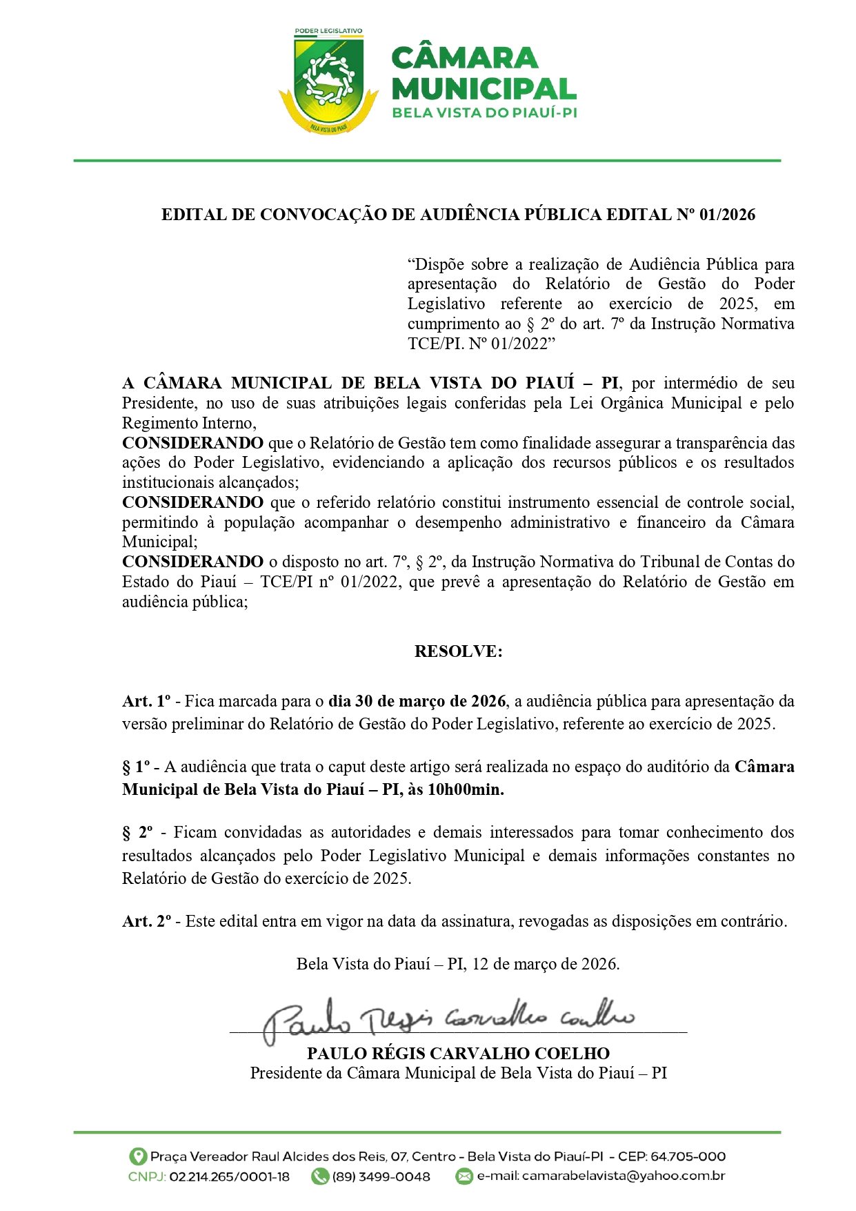 A Câmara Municipal de Bela Vista do Piauí, realizará no dia 30 de março de 2026, às 10h, no espaço do auditório da Câmara, a Audiência Pública para apresentação do Relatório de Gestão do Poder Legislativo referente ao exercício de 2025.